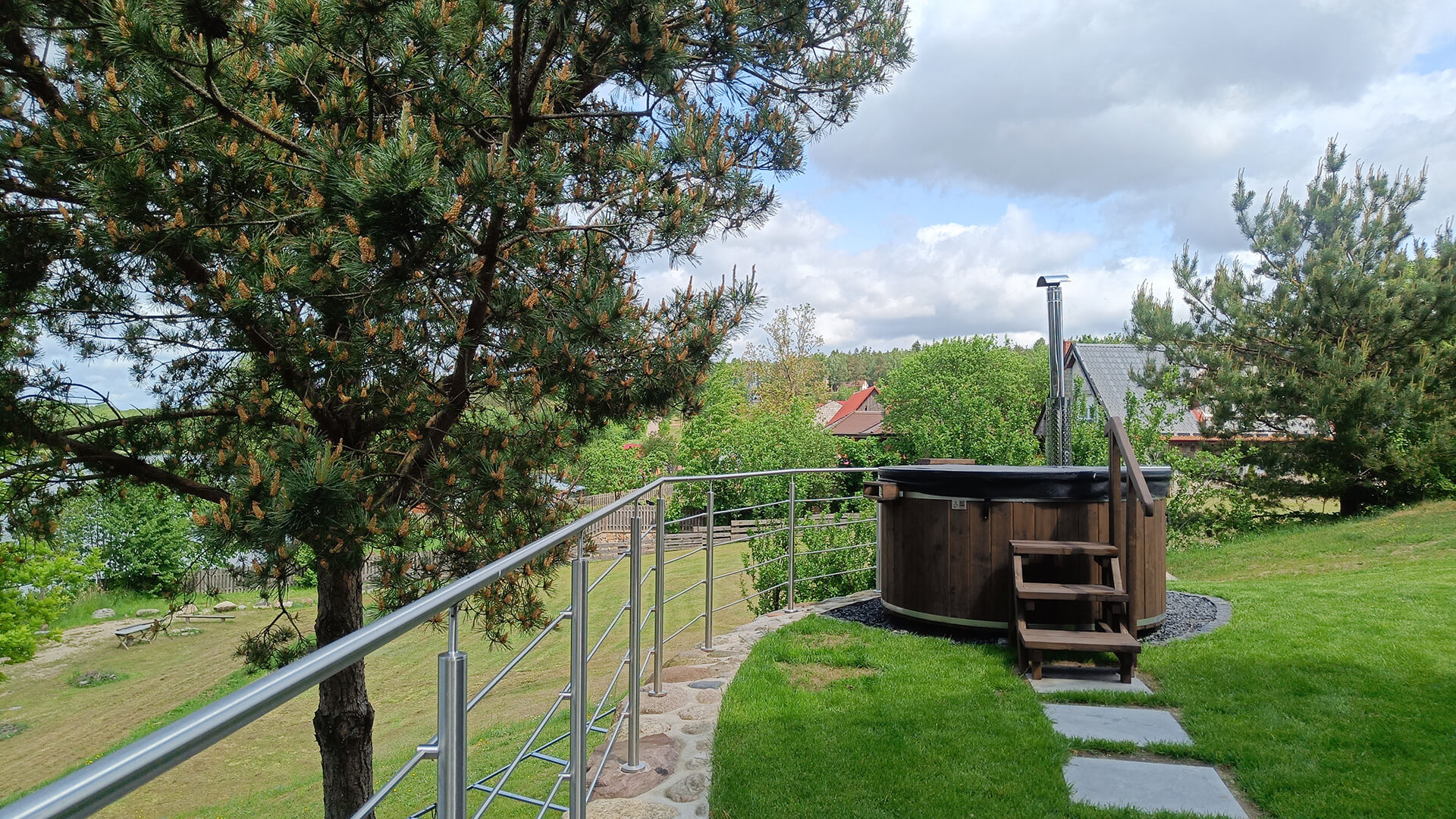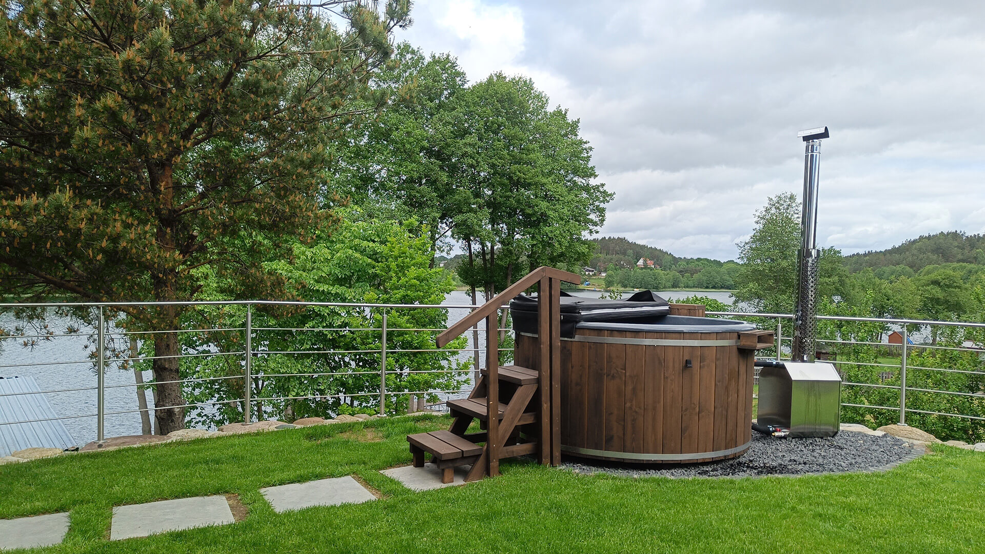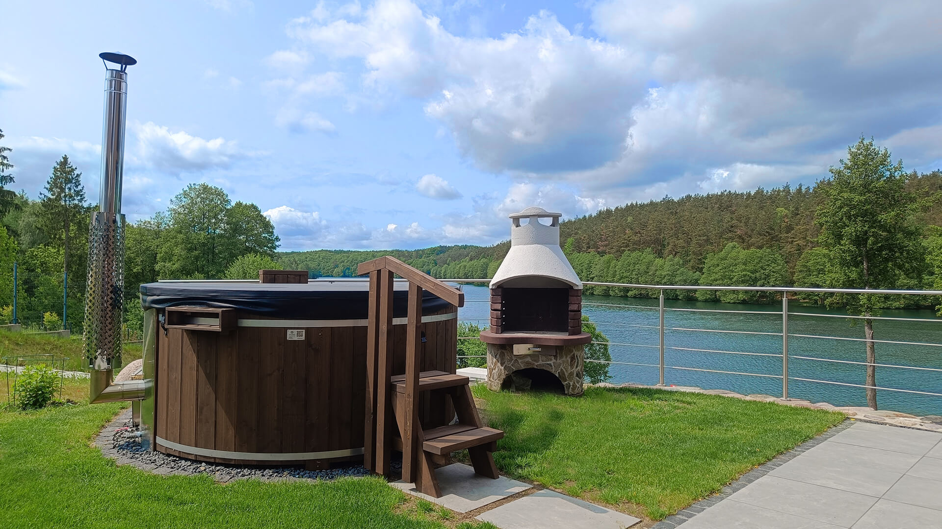 Drewniana balia z piecem i grill ogrodowy na tarasie z widokiem na jezioro i las – Kaszubskie Tarasy
