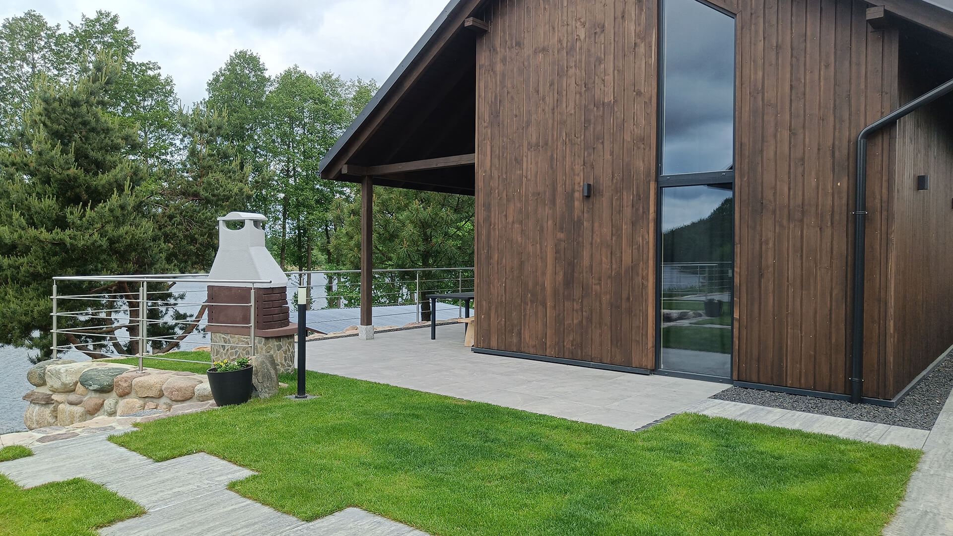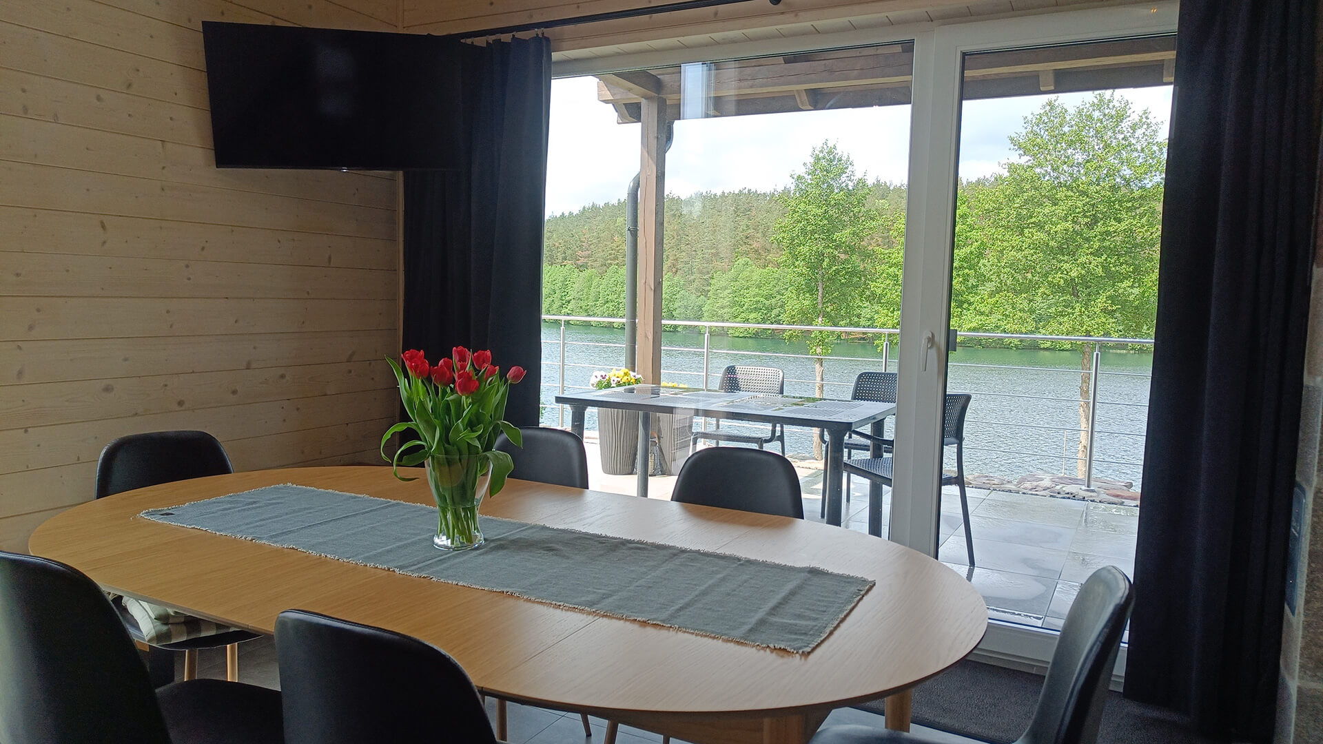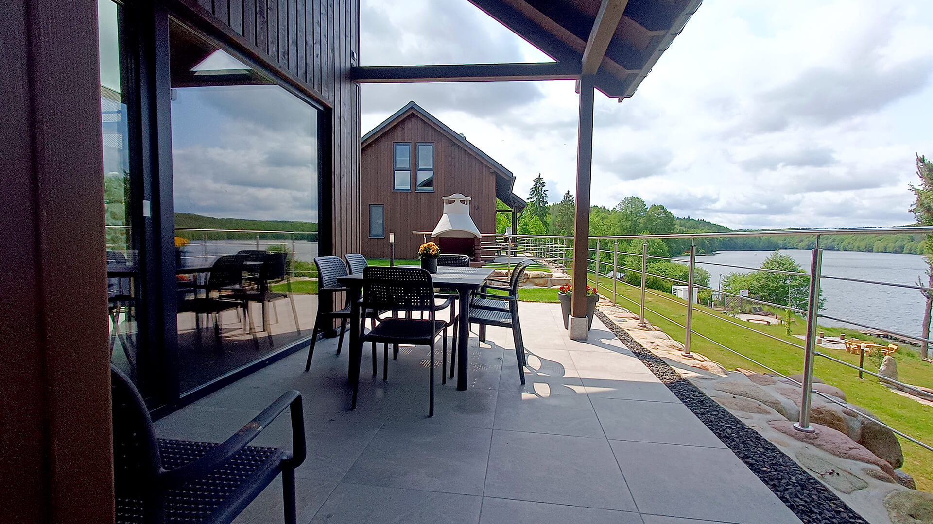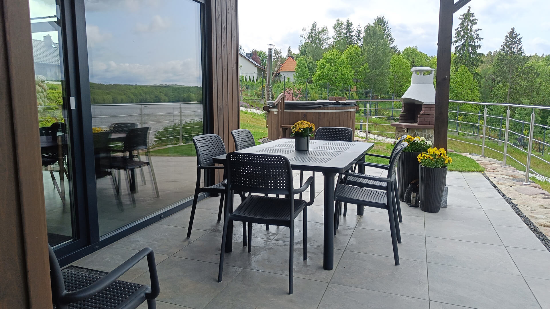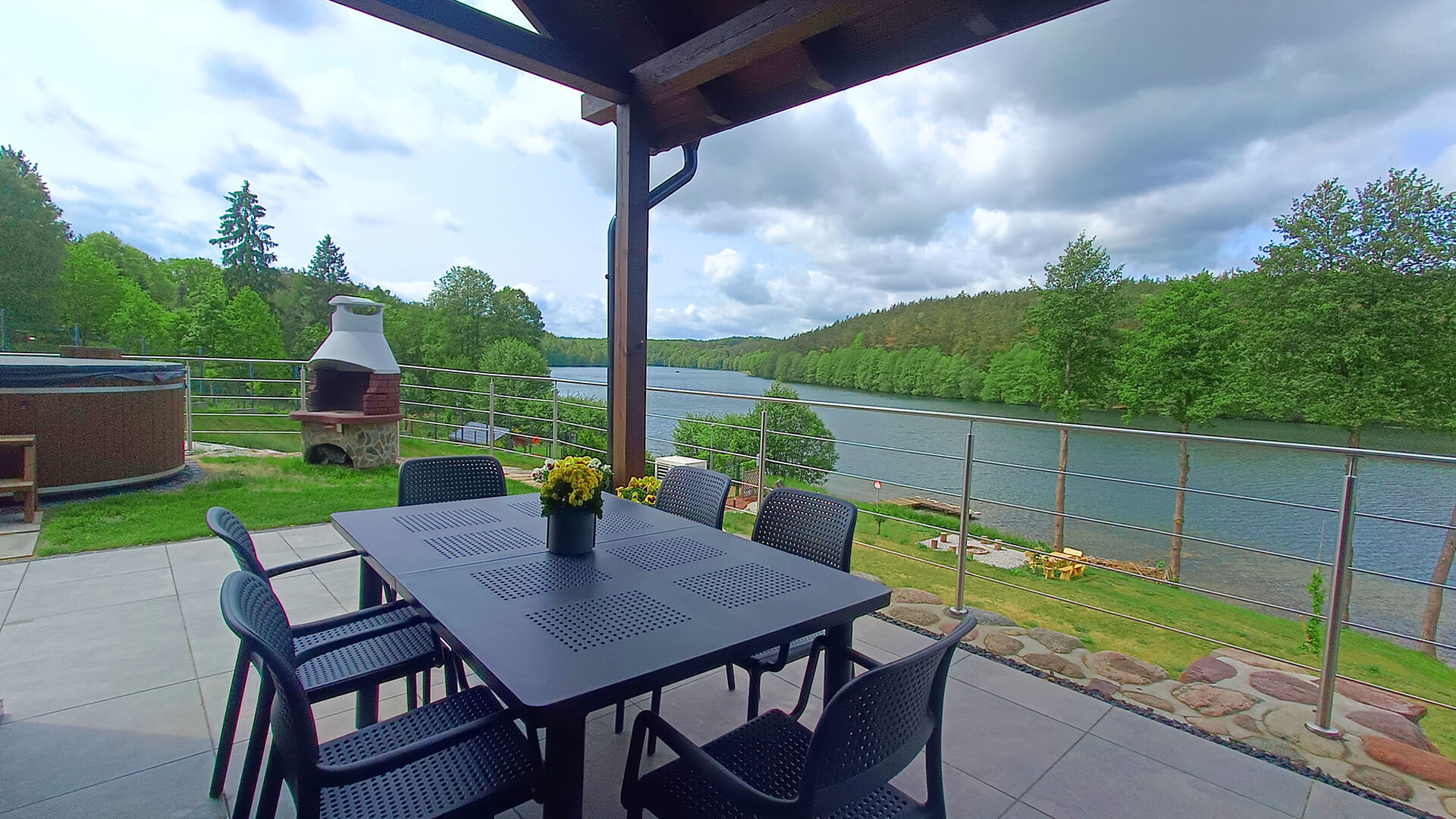Zadaszony taras z widokiem na jezioro, czarny stół ogrodowy z krzesłami i grill w tle – Kaszubskie Tarasy