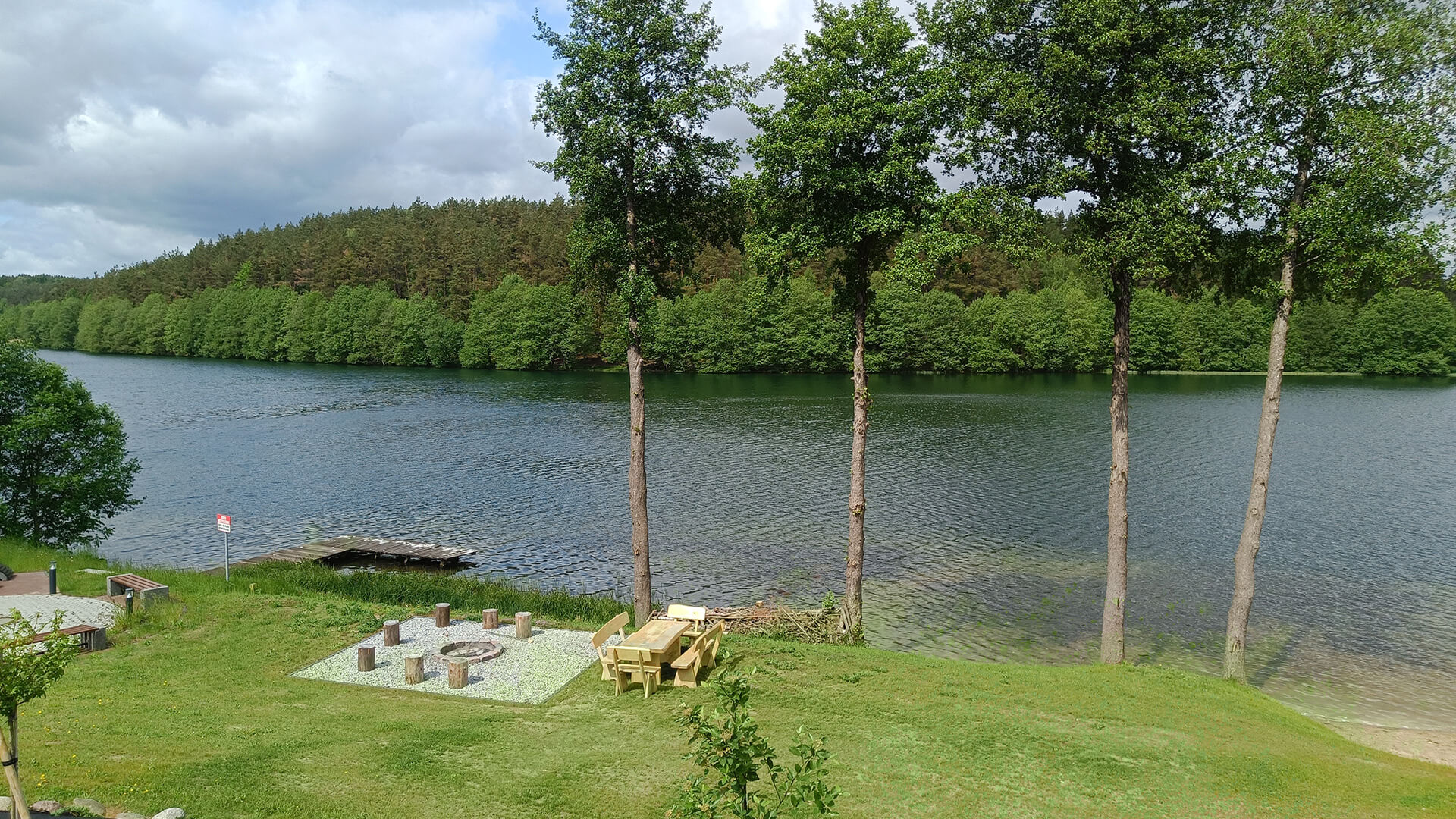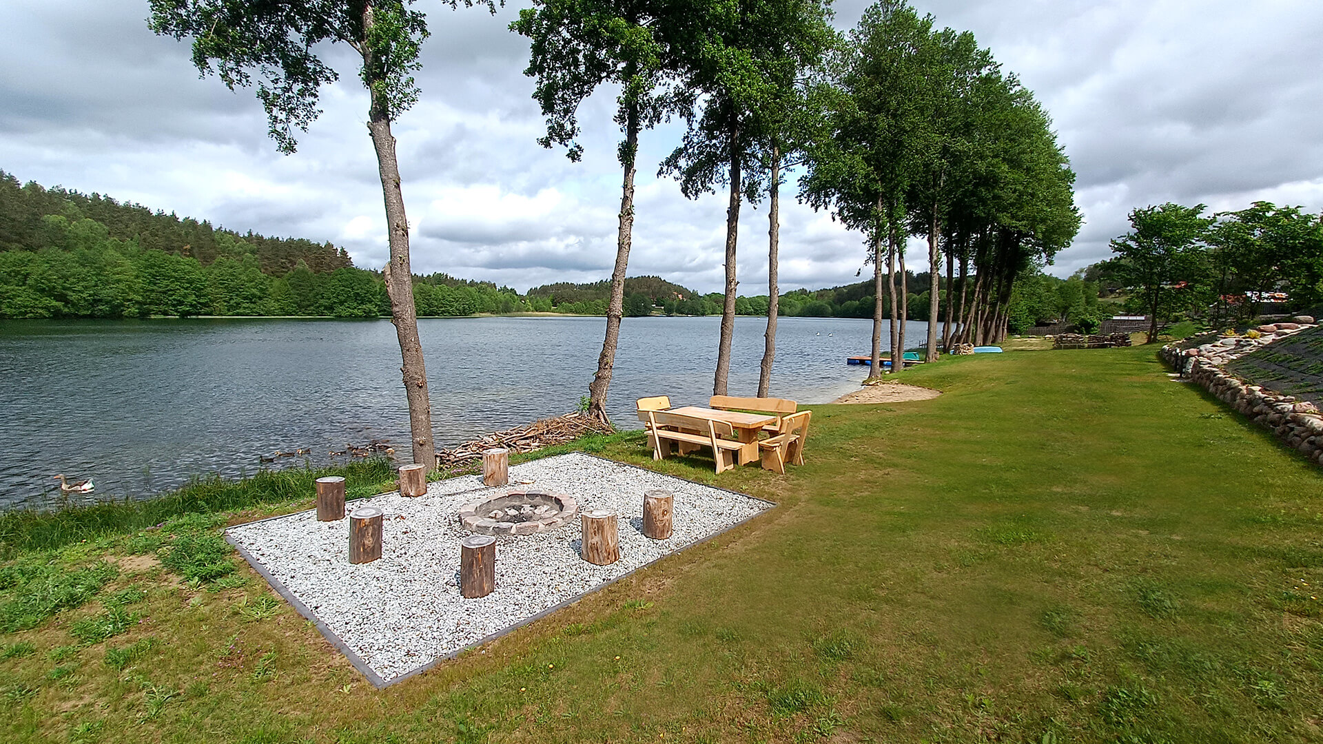 Tuż nad brzegiem jeziora, wśród kaszubskiej przyrody, czeka przygotowane miejsce na ognisko – idealne na wieczory z gitarą, pieczenie kiełbasek i rozmowy do późna.