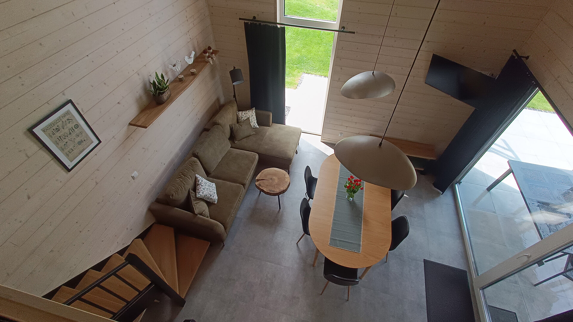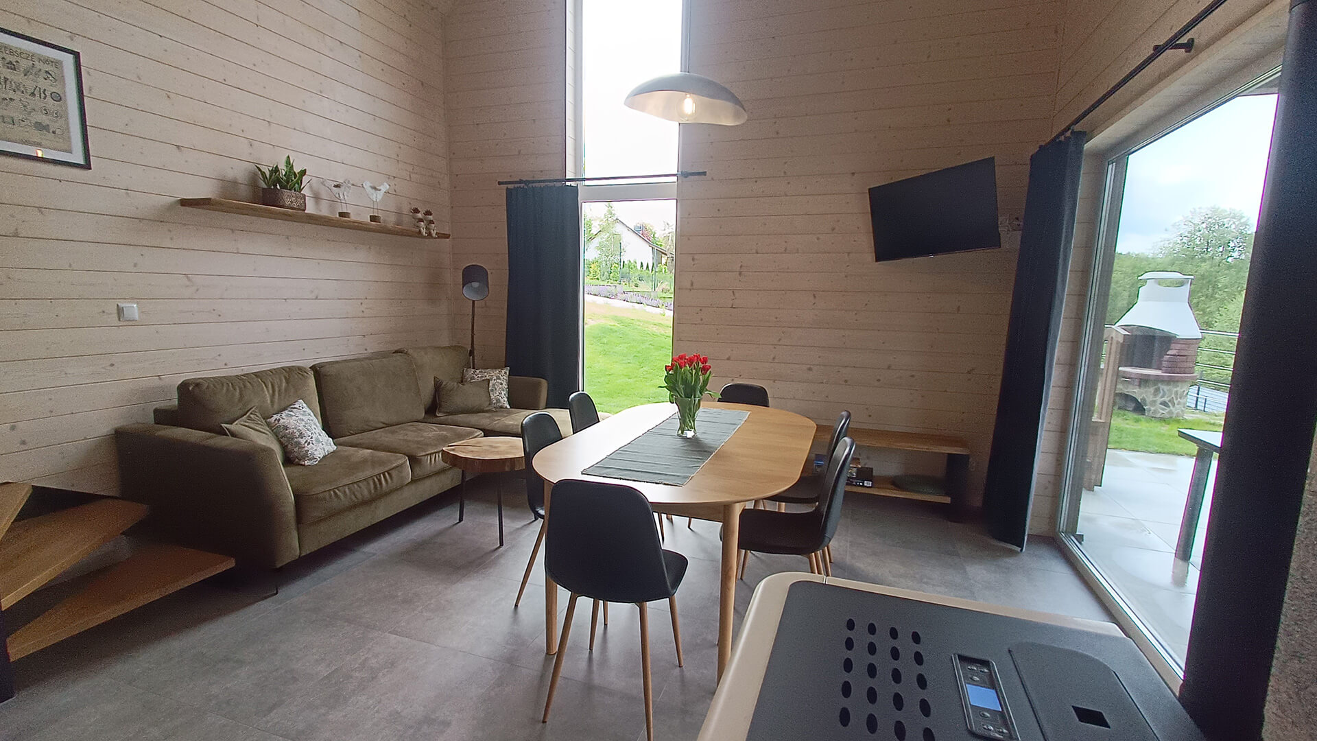 • salon z jadalnią (telewizor, rogówka z funkcją spania dla dodatkowych 2 osób, kominek na pelet)