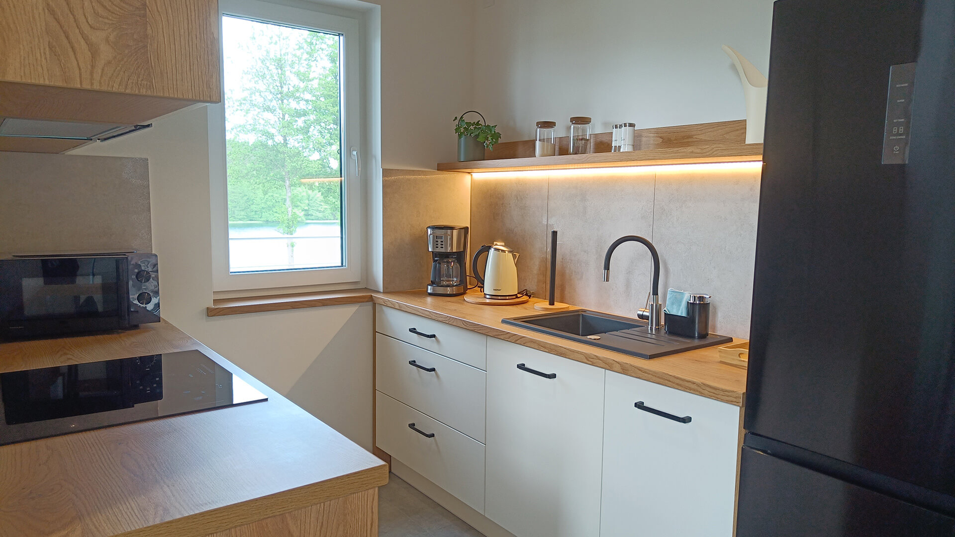 • kuchnia (zlew, zmywarka, płyta indukcyjna czteropalnikowa, piekarnik, mikrofalówka, przelewowy ekspres do kawy, czajnik elektryczny, zastawa stołowa dla 8 osób, garnki, patelnie itp.)