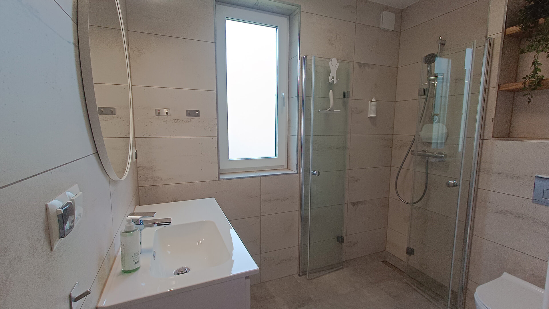 • łazienka (prysznic, toaleta, umywalka z szafką, suszarka do włosów, grzejnik + ogrzewanie podłogowe)